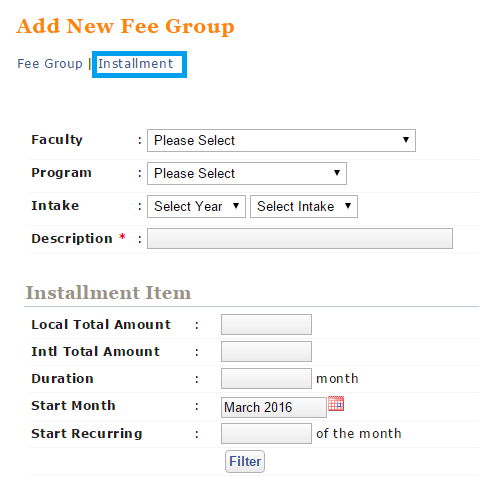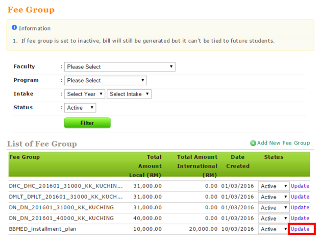 Navigate to Finance > Fee Group > Update to update the fee group installment.