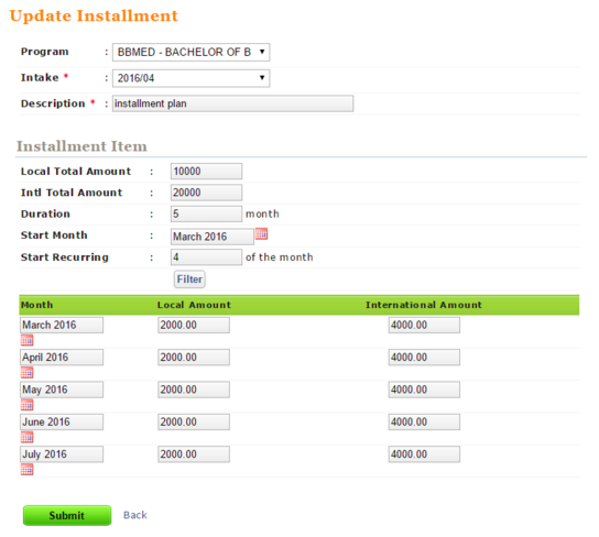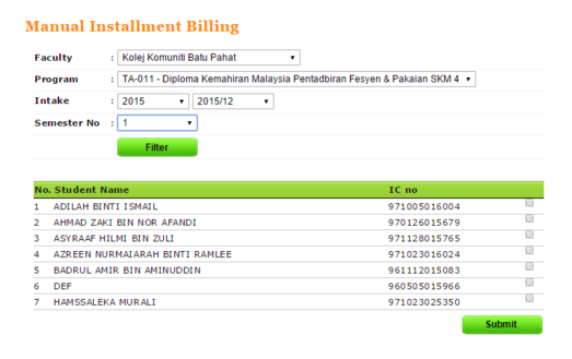 Tick all the name that related to the Installment Plan Billing. Then user may proceed to Submit.