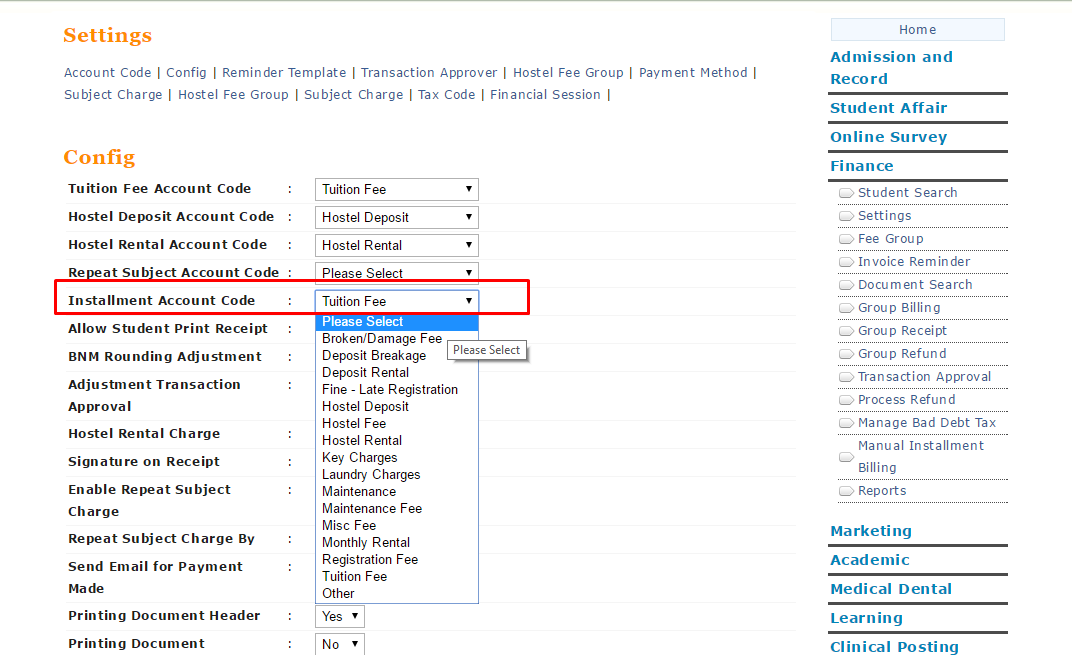 First, user need to define what is the default Account Code for the Installment Fee Group. Kindly navigate to Finance > Settings > Config > Installment Account Code.
