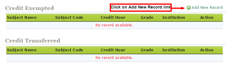 Click on Add New Record link to add list of subject exempted and list of subject to be transferred.