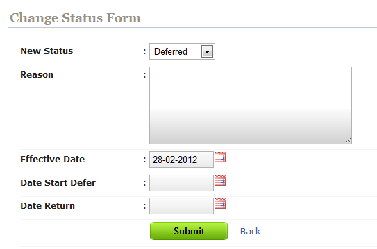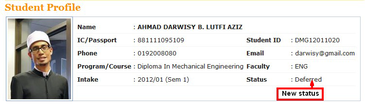 There are few list of student status such as graduated, active, completed, deferred, terminated and withdrawn. Student status can be changed to any of the above depending on the situation. For example in the above figure if the student is having health problem and he/she needs to postpone his/her study . In this case, status for this student can be changed to deferred. User must enter effective date, date start to defer, date return and press Submit button. Verify new status will appear in student profile as per below figure.