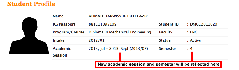 Student semester will be increased and academic session will be changed to the current academic session as displayed in Student Profile below.
