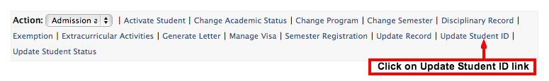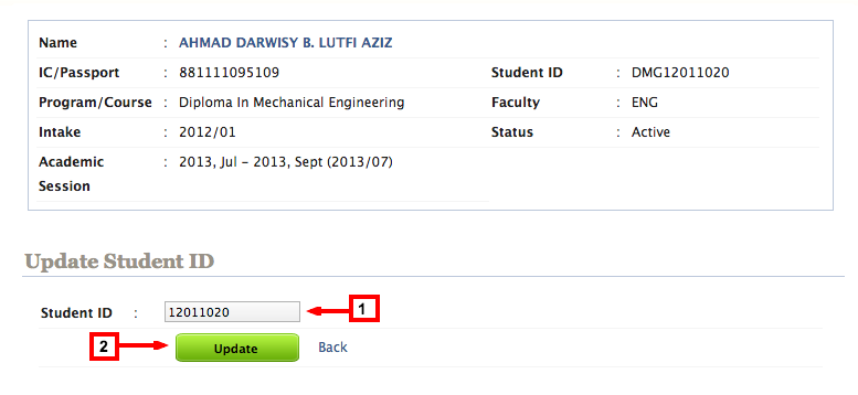 Update Student ID is a function used to change the current student ID to the new student ID. Some universities/colleges might have different format of student ID. In order to cater the needs, user might use Update Student ID to make amendment on current student ID which is generated based on the intake number, campus number and running number. Perform the following steps to update student matrix number: