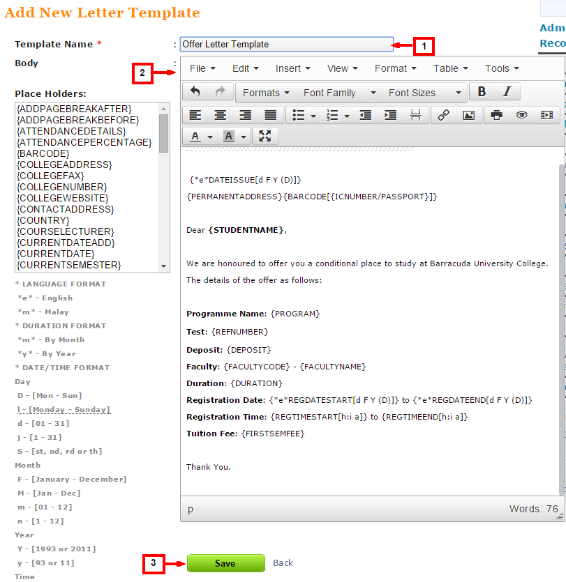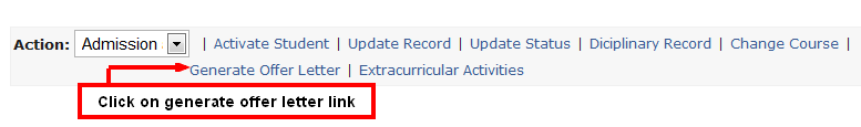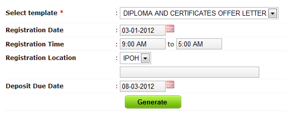 In order to generate offer letter which will be sent to the student, letter template must be created first. User is able to create their own template letter in Generate Letter Template by clicking on the Generate Letter Template link.