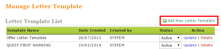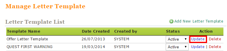 Click on the Update link to amend the existing template and Delete link to remove the template.